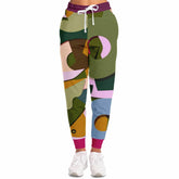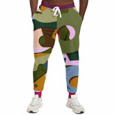Take a walk on the wild side with the Pink Abstract Jungle Eco-Poly Camo Unisex Joggers. This eye-catching design fuses geometric abstraction with jungle-inspired color blocking—featuring a rich blend of olive green, mustard yellow, blush pink, deep forest, and sky blue. The bold, layered camo motifs are paired with maroon waistband accents and hot pink cuffs for an unexpected pop of modern streetwear flair.