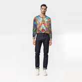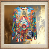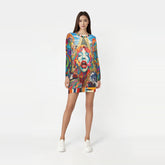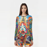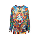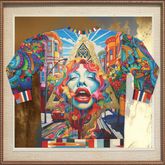 Intricate violet and emerald floral patterns twist along the sleeves, complementing the golden architectural elements that frame the design. The kaleidoscopic hues evoke the turbulence of unspoken thoughts, while the striped rainbow cuffs and neckline add an extra pop of color. More than just fashion, this piece is a call to self-expression and advocacy. Stand boldly against the silencing of voices—wear your message with unapologetic style. Freedom starts here.