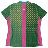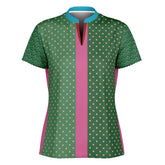 Bring bold energy and refined charm to the fairway with the Criss Cross Golf in Green Mandarin Collar Ladies Golf Polo Jersey. This vibrant design combines playful sophistication with athletic functionality, featuring a green body adorned with golden polka dots, flanked by striking pink panels and sleeves detailed with a crisp white crossed-club motif. A contrasting turquoise mandarin collar and a sleek notch neckline add a pop of modern flair, while the tailored fit keeps it polished yet comfortable. Crafted from lightweight, moisture-wicking eco-poly fabric, this jersey is breathable, easy to care for, and designed to move with you on and off the course.