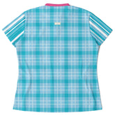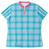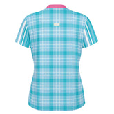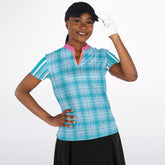 This vibrant Trapped in Blue Skies Mandarin Collar Ladies Golf Polo Jersey is a fresh and stylish addition to your golf wardrobe. Featuring a serene blue plaid body that evokes open skies, it’s complemented by playful striped sleeves in coordinating tones of blue and white. The crisp mandarin collar is lined in a pop of pink for an unexpected, feminine accent, while the open neckline gives it a breezy and modern feel. Designed with both fashion and function in mind, this polo offers comfort, breathability, and a flattering fit — perfect for the course or clubhouse.