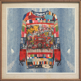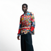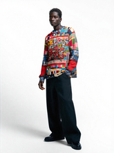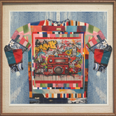 The patchwork sleeves showcase an eclectic mix of patterns and colors, each piece telling a story of its own, adding a unique, artistic touch. Perfect for music lovers and retro enthusiasts alike. Make a statement and let the music play. Get yours today and rock your love for the golden age of hip-hop!