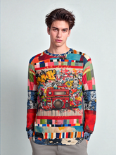 Inspired by retro prints from the 80s and 90s, this unique sweatshirt features a striking central graphic of a classic red boombox surrounded by dynamic graffiti art, celebrating the energy and spirit of street culture. The eclectic design incorporates a variety of colorful patterns and textures, making each piece one-of-a-kind. Crafted from premium materials, it ensures a comfortable fit and long-lasting wear.