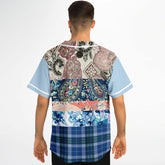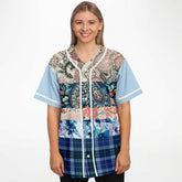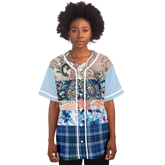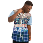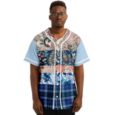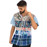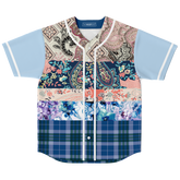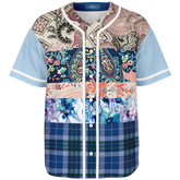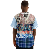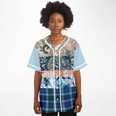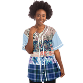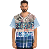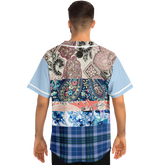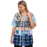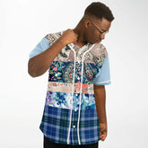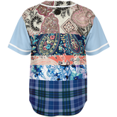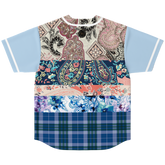 The 'Dolores Park Paisley' Eco-Poly Button Front Jersey combines a playful patchwork of vibrant paisley, floral, and plaid prints in a harmonious mix of blues, peaches, and greens. Designed for comfort and style, this short-sleeve jersey features a classic button front and white piping along the neckline and sleeves for a clean, retro-inspired finish. The midweight, eco-poly athletic wear fabric is breathable and versatile, perfect for layering or wearing solo on warm days.