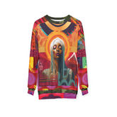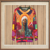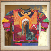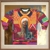 The background print captures the ethereal essence of the holy being, while vibrant colors bring the design to life. Multiple fabric prints on the sleeves add a unique touch, making this sweatshirt truly one-of-a-kind.