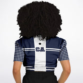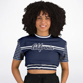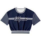Celebrate West Coast vibes with a sporty twist in the Wimbledon in Blue Stripe California Edition Eco-Poly Short Sleeve Cropped Pullover. This striking piece features a deep navy base with crisp white stripes across the chest and “California” elegantly scripted front and center, paying homage to golden state pride. The short sleeves bring playful contrast with a navy and white grid pattern, adding texture and visual interest. The back showcases bold “CA” lettering over a vertical white panel, completing the collegiate-inspired design. Crafted from midweight eco-poly athletic wear fabric, it delivers breathable comfort and durability. The elasticized waistband with matching stripes creates a flattering cropped fit that blends vintage athletic style with California cool.