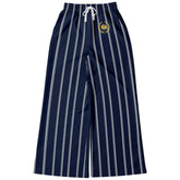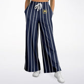 Elevate your look with the Wimbledon Regal Stripe in Blue Eco-Poly Wide Leg Pants, a striking blend of classic sport and modern comfort. Featuring crisp white vertical stripes on a rich navy blue base, these pants capture the elegance and prestige of iconic court style. The gold crest emblem at the waistband adds a touch of regal charm, making this pair perfect for those who appreciate refined details. Crafted from midweight eco-poly athletic wear fabric, they offer breathability, quick-drying ease, and all-day comfort. The relaxed wide-leg cut, elastic drawstring waist, and hidden side seam pockets deliver versatility and function, ideal for chic lounging, casual outings, or sporty-inspired ensembles.
