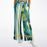 The Interior Salon with Forget-Me-Nots Eco-Poly Wide Leg Pants blend painterly charm with architectural elegance, evoking the tranquil beauty of a sunlit atelier. Vertical stripes in soft mint, teal, and ivory elongate the silhouette, while abstract brushstrokes and florals unfold in a harmonious balance of art and nature. The back reflects this duality beautifully—one leg blooming with a lush field of white and blue forget-me-nots, the other adorned with refined vertical stripes that create a striking visual contrast. Subtle gold bands near the hem and a stained-glass-inspired waistband add a refined finishing touch reminiscent of decorative Art Nouveau panels.
