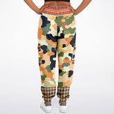 Turn heads with a fierce fusion of street-ready grit and art-forward flair in the Peachtree in Orange Camo Eco-Poly Cargo Joggers. A warm painterly camo base in olive, sand, burnt orange, and inky navy is interrupted by unexpected pattern play—striped cargo pocket bands, mini geo-tile accents at the cuffs, and patch-work paneling at the hips that feel fresh, alive, and boldly original. They bring the energy of creative rebellion and Southern-city swagger, making them just as at home on a gallery stroll as they are on a casual coffee run or outdoor adventure day. Comfort meets confidence, and function meets fashion—with a vibe that's unapologetically one-of-one.