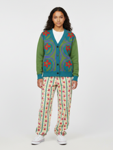 Step into playful retro charm with the Daisies on Me in Green Knitted Cardigan. This vibrant cardigan blooms with bold red daisies nestled inside circular frames of violet and teal, creating a joyful garden of repeating patterns across a lush green background. The design balances whimsy and sophistication, making it a standout layering piece for any season. A deep teal ribbed trim, cuffs, and hem add structure while grounding the lively print in timeless style.
