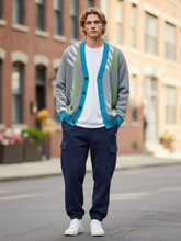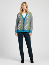 The Leaves in the Palm in Grey Knitted Cardigan brings a natural, organic touch to your wardrobe with its bold yet calming pattern. Shades of green and white palm-inspired leaves cascade across a soft grey backdrop, creating a fresh and modern aesthetic. The contrast trim in a cool teal blue highlights the button placket, cuffs, and hem, adding a refined pop of color that makes the design stand out. Its relaxed yet tailored silhouette ensures it layers beautifully, whether buttoned up as a statement piece or left open over a tee for a casual look.