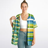 Bring retro cool into the now with this Blue Green Abstract 70s Blob Stripe Reversible Baseball Jersey. One side bursts with vintage charm—featuring groovy circular blobs and horizontal stripes in oceanic greens, teals, and mustard yellows, accented by checkerboard plaid shoulders and sleeves for extra flair. Flip it, and you’ve got a bold striped side with clean white piping and abstract line art detailing the sleeves—a nod to mid-century modern art.