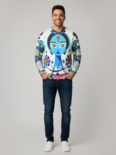 Immerse yourself in divine elegance with the Blue Devi Goddess Floral Unisex Sweatshirt, a stunning fusion of spirituality and modern art. The design centers on a serene blue goddess with expressive almond-shaped eyes and an aura of calm power, surrounded by stylized floral motifs in bold hues of cobalt, emerald, orange, and violet. Her celestial presence radiates across a creamy backdrop, while the sleeves explode with hypnotic circular patterns and vibrant stripes reminiscent of festival lights and temple murals. The composition evokes harmony between strength and grace—perfect for those who embrace both creativity and balance in their personal style.