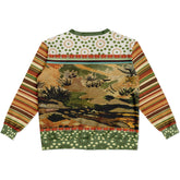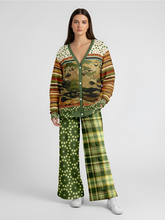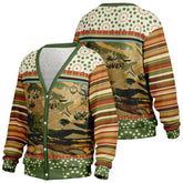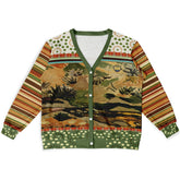Blending painterly beauty with contemporary design, the Brook with Aloes in Patchwork Heavyweight Unisex Cardigan captures the essence of desert tranquility through an artful mix of stripes, polka dots, and nature-inspired landscapes. Earthy hues of olive, russet, and sand are contrasted with playful pattern borders, creating a piece that’s as distinctive as it is wearable. The bold visual rhythm and relaxed silhouette make it a versatile statement layer for any wardrobe.