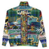 The Basel at the Rhine Heavyweight Oversized Quarter Zip Sweatshirt brings a kaleidoscopic blend of painterly landscapes, bold geometry, and unexpected patchwork to a single show-stopping piece. Inspired by the vibrant banks of the Rhine, the front centers on a vertical column of swirling, trippy circular motifs framed by expressive brushstrokes of green, gold, cerulean, and magenta. Surrounding it are panoramic town scenes—colorful buildings, sloping rooftops, and river views—intercut with tartan panels, mixed plaids, and hand-painted abstracts. The sleeves layer even more visual storytelling: checkerboard borders, painterly florals, pop-art marks, and coastal blue accents that echo the waterline. A shield-style crest on the left chest adds a refined, collegiate nod, while the multicolor banded collar ties the entire palette together.