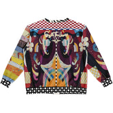 This heavyweight unisex cardigan, Composition in Nines – Kandinsky, transforms abstract composition into wearable art by blending multiple Kandinsky-inspired motifs into a single, rhythmic design. Bold color blocks, geometric accents, checkered elements, and expressive curves interact across the front, sleeves, and back, creating visual movement from every angle, while contrast trims—including zebra striping and polka-dot ribbing—add a playful yet intentional finish that frames the artwork beautifully.