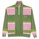 Step into playful sophistication with the Hopscotch in Green and Pink Windowpane Heavyweight Quarter Zip Unisex Pullover, a bold yet refined piece that celebrates color and pattern. Featuring a striking patchwork of olive green and soft pink windowpane checks, dotted grids, and wide stripes in cream and lime, this design brings together preppy charm and contemporary style seamlessly.