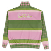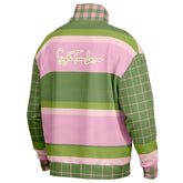 The high stand collar and quarter-zip front lend a sporty, polished vibe, while heavyweight fabric ensures warmth and structure. Thoughtful details make this piece truly special — note the gingham plaid accents at the collar and cuffs, adding a whimsical nod to classic haberdashery. The ribbed waistband and cuffs keep the fit snug and flattering, and an embroidered crest on the chest delivers a collegiate feel.
