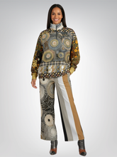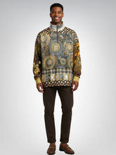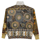 Make a statement in earthy sophistication with the I’m Feeling Brown Aboriginal Swirl Patchwork Heavyweight Oversized Quarter Zip Sweatshirt, a gallery-worthy blend of Aboriginal-inspired dot-art, global motifs, and warm neutral tones. The front and back feature expansive swirl patterns in shades of caramel, taupe, ivory, charcoal, and gold, creating a hypnotic, circular movement across the body. Patchwork sleeves introduce botanical and ethnic elements in deep greens, rusts, ochres, and browns, adding richness and depth. A plaid band along the waist, ringed geometric border, and mixed polka-dot hem bring structure and balance to the maximalist design, while the high collar frames the face beautifully for a bold yet grounded aesthetic.