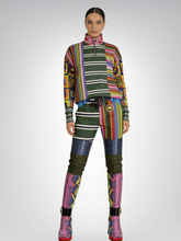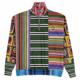 Striped in Silence Rugby Stripe Heavyweight Oversized Quarter Zip Sweatshirt brings contrast, composition, and confidence into one art-forward silhouette. The front showcases a carefully balanced patchwork of vertical and horizontal rugby stripes—anchored by deep forest green bands at center, flanked by multicolor striping and framed with painterly circular motifs along the sleeves. A zip-front neckline reveals a playful, patterned collar lining that adds an unexpected layer of visual intrigue.