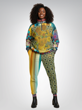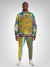 Inspired by Van Gogh’s iconic sunflower study from 1888, the Sunflowers in My 1888 Van Gogh Heavyweight Oversized Quarter Zip Sweatshirt transforms fine art into expressive, wearable form. A richly detailed sunflower still life dominates the front and back, rendered in warm golden yellows, ochre, and earthy browns, set against a teal and turquoise patterned backdrop that adds depth and visual movement. Vertical bands of muted mustard, rust, cream, and blue frame the artwork, creating a gallery-like composition.