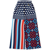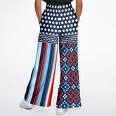 A tale of bold contrasts and harmonious design, the Tale of Two Cities Duo Print Eco-Poly Wide Leg Pants delivers a statement look like no other. The top half flaunts a playful navy-and-white polka dot pattern with a crest emblem near the waistband for a dash of preppy flair. Below the dotted border, the right leg erupts in a vibrant pixelated checker motif in shades of red, navy, and icy blue, evoking an urban mosaic. Meanwhile, the left leg keeps it crisp with vertical racing stripes in navy, sky blue, red, and white—clean, modern, and energetic.