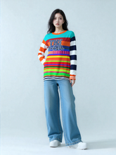 The 'Crazy Dayglo Static Rugby Stripe' unisex sweatshirt is a head-turning explosion of color and pattern, perfect for those who love bold, unapologetic fashion. With vibrant horizontal stripes in neon greens, electric pinks, fiery oranges, and deep blues, this sweatshirt brings a retro-inspired, high-energy aesthetic to any outfit. The contrasting rugby-striped sleeves, one in classic orange and white, the other in navy and white add an unexpected twist, making this piece a true standout.