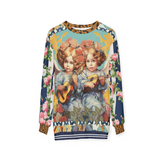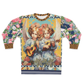 Embrace the timeless charm of innocence and melody with the 'Songs of an Angel - Cherubs at Play' Unisex Sweatshirt. This unique piece showcases a beautifully detailed design featuring two cherubic children serenading with tiny instruments, surrounded by a cascade of vibrant florals. The patchwork-inspired sleeves mix floral patterns and subtle leopard print accents, adding a whimsical contrast to the classic cherub motif. Perfect for anyone who adores vintage art with a modern twist, this sweatshirt merges comfort and artistry, making it an eye-catching addition to your wardrobe.