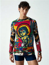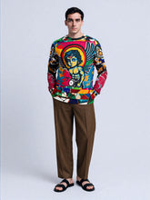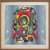 The sleeves elevate the drama with a masterful patchwork of mosaic tiles, floral prints, and stained-glass patterns—each section telling its own visual story. Pops of crimson, gold, teal, and black dance across the garment in a rebellious yet harmonious rhythm. It's the ultimate collision of sacred iconography and contemporary grit.