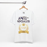Step into your own elite bubble with the Anti-Socialite VIP Club Short Sleeve Tee, the perfect uniform for those who prefer their circles small and their standards sky-high. Featuring a bold graphic crowned with luxe gold laurels and a playful VIP emblem, this tee celebrates the introverts, the boundary-keepers, and anyone who treats solitude like a private members-only lounge.