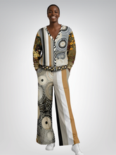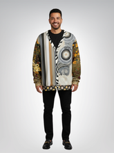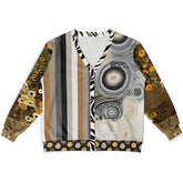 Wrap yourself in depth, culture, and earthy elegance with the I’m Feeling Brown Aboriginal Swirl Patchwork Heavyweight Unisex Cardigan, a stunning fusion of neutral striping, ethnic botanicals, and Aboriginal-inspired circular dot motifs. The front features a bold split design—structured vertical stripes on one side and swirling dot-art rings on the other—framed by a zebra-striped placket that adds unexpected contrast. The back continues the storytelling with an expansive field of Aboriginal swirl patterns in taupe, caramel, ivory, charcoal, and soft gold, while both sleeves layer rich botanical prints in olive, ochre, rust, and espresso tones. Patchwork cuffs and a polka-dot hem complete the mixed-media aesthetic, giving the cardigan an art-gallery feel from every angle.