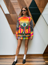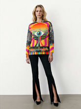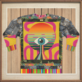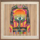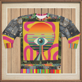 The sleeves tell a different story, blending rugged denim patchwork textures and metallic rivet detailing for a rebellious, urban edge. Camouflage borders and layered geometric motifs wrap around the body, grounding the surreal artwork in a raw street-style aesthetic. Rainbow-striped cuffs, collar, and hem burst with playful vibrancy, completing the look with a fearless pop-art punch.