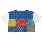 Channel rodeo flair with a streetwear twist in the Western Edition Bandana Patchwork Eco-Poly V-Neck Crop Jersey—a vibrant celebration of Americana through bold color, pattern, and craftsmanship. This standout piece features a patchwork design made up of classic Western motifs: paisley bandana prints in red, yellow, brown, and two shades of blue, balanced by a navy star-spangled square and a blue gingham yoke that nods to rustic charm. Crisp white short sleeves and a modern cropped silhouette bring freshness and contrast to the traditional patterns, while the V-neckline adds a sporty, flattering touch.