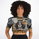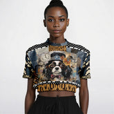 Step into bold, eclectic fashion with the Curly Magoo Wild Denim Patchwork Eco-Poly Cropped Pullover. This statement piece blends deep indigo blues, warm caramel browns, rich golden yellows, and striking black-and-white contrasts. The mix of denim textures, leopard print, polka dots, and faux fur elements creates a fearless patchwork aesthetic. The front showcases a steampunk-inspired dog wearing round glasses and a bowtie, framed by vintage clock elements, adding a touch of antique charm, while the back continues the patchwork theme with intricate stitching and textural contrasts in moody blues and earthy tones.