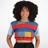 Celebrate Americana with a twist in the Western Edition Bandana Patchwork Eco-Poly Short Sleeve Cropped Pullover. This vibrant top features a bold medley of classic bandana prints, gingham checks, star-spangled panels, and grid patterns in shades of red, blue, yellow, and brown. The eclectic patchwork design pops against light blue sleeves, adding a playful contrast that brings modern flair to vintage western motifs.