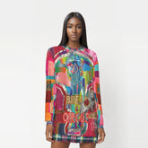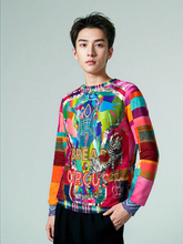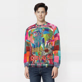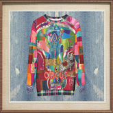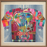 Featuring a kaleidoscope of colors and multiple fabric prints on the sleeves, it promises a unique visual feast. At its heart, the bold elephant, never forgetting, always reminding, makes a striking statement on political spectacle amid a patchwork of plaid, stripes, and abstract patterns.