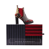Mary Queen of Scot Elasticized Chelsea Ankle Boot reigns with unapologetic regality, merging tartan heritage, wild-print drama, and sculptural Italian craftsmanship into a single unforgettable statement piece. The bold interplay of red Highland plaid, hair-on zebra striping, and hair-on leopard print creates a visually arresting collage—an homage to fearless queens who defied convention. Vibrant red elastic side panels bring modern edge and ease of wear, while the gold quilted heel counter adds a final note of aristocratic glamour. Rich textures, couture-level pattern mixing, and a commanding silhouette transform this boot into wearable art for those who lead rather than follow.