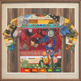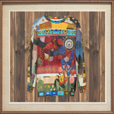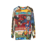 The garment’s borders and cuffs introduce mosaic-inspired detailing in jewel tones, while the sleeves merge two additional Paul Klee paintings—carefully blended into landscape textures and horizon-like color blocking that expand the world beyond the original canvas.