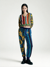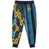 Make a regal statement with the Rear Admiral Baroque Rugby Stripe Eco-Poly Unisex Joggers. These bold joggers fuse tradition and flair with one leg featuring a golden baroque mosaic pattern of interlocking tiles in navy, turquoise, and gold, while the other sports commanding rugby stripes in deep blue tones accented with gold piping. A crowned crest emblem adds a final touch of aristocratic edge to the sporty silhouette.