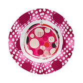 Pink bucket hat with white polka dots and red abstract design on a white background