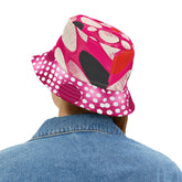 Back view of a pink bucket hat with abstract pattern and white polka dots on a white background