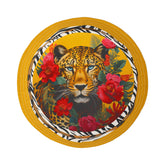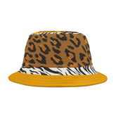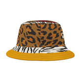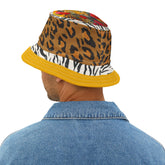 Untamable style meets artful detail in the Leopard in Bloom Vibrant Bucket Hat, a fierce mash-up of safari motifs and florals designed to turn every sidewalk into your runway. The crown is wrapped in classic tawny leopard spots, banded by a bold ring of zebra stripes that adds graphic contrast. A golden outer brim frames it all with sunny energy, while the top panel delivers the showstopper: a regal leopard portrait surrounded by lush red blooms, a jungle-chic medallion that reads luxe from every angle.