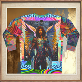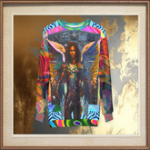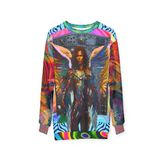 The sleeves and hem feature a kaleidoscopic patchwork of swirling neons, digital patterns, and tribal motifs that echo the battle between light and darkness. Designed in midweight eco-poly fabric, this piece offers breathable comfort with a relaxed fit—ideal for layering or standing alone as wearable art. Whether you're moved by the spiritual message or drawn to its electrifying visual energy, this sweatshirt speaks to warriors of both faith and fashion.