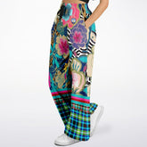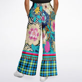 Step into a world of color and creativity with the Blue Petunia Floral Stripe Eco-Poly Wide Leg Pants. Designed for those who embrace bold fashion, these pants feature a mesmerizing mix of vibrant floral motifs, animal prints, and plaid patchwork, tied together with striking contrast stripes along the hem.