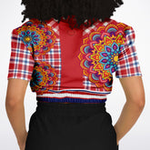 The 'Hippy-Dippy Plaid Eco-Poly Cropped Short Sleeve Sweater' blends retro charm with modern style. Featuring a vibrant plaid pattern paired with intricate mandala-inspired prints, this cropped sweater is a statement piece that exudes playful sophistication. Crafted from an activewear eco-poly fabric, it's lightweight, breathable, and sustainably made, perfect for those with an active lifestyle.
