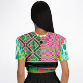 Make a bold and playful statement with the 'Kelly is So Very Plaid' Eco-Poly Short Sleeve Cropped Sweater. This vibrant piece combines a mix of colorful plaid and geometric patterns in shades of green, pink, teal, and yellow for a fun, eclectic look. Crafted from eco-poly fabric, it offers a lightweight, breathable feel, perfect for casual outings or layering with your favorite high-waisted bottoms. The elasticized hem adds a stylish touch while ensuring a comfortable fit that stays in place. Express your love for unique, retro-inspired fashion with this standout design.