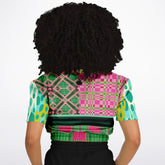 Crafted from an activewear eco-poly fabric, it offers lightweight breathability and sustainable style. Whether you're making a bold fashion statement or adding a splash of color to your everyday look, this sweater is the perfect choice to celebrate your individuality and flair. Perfect for layering or wearing solo. The short sleeves and cropped silhouette add a playful touch, while the bold mix of patterns ensures you'll make a statement wherever you go. Elevate your everyday style with this bold, artistic design that's as comfortable as it is stylish.