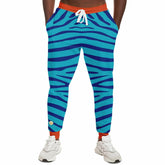 Unleash bold energy with the Zebra in Blue Eco-Poly Unisex Joggers, a wild fusion of animal instinct and modern flair. Featuring vibrant aqua and deep navy zebra stripes, these joggers are designed to make a splash wherever you go. The burnt orange waistband and cuffs add a fiery pop of contrast, giving the look an unexpected edge.